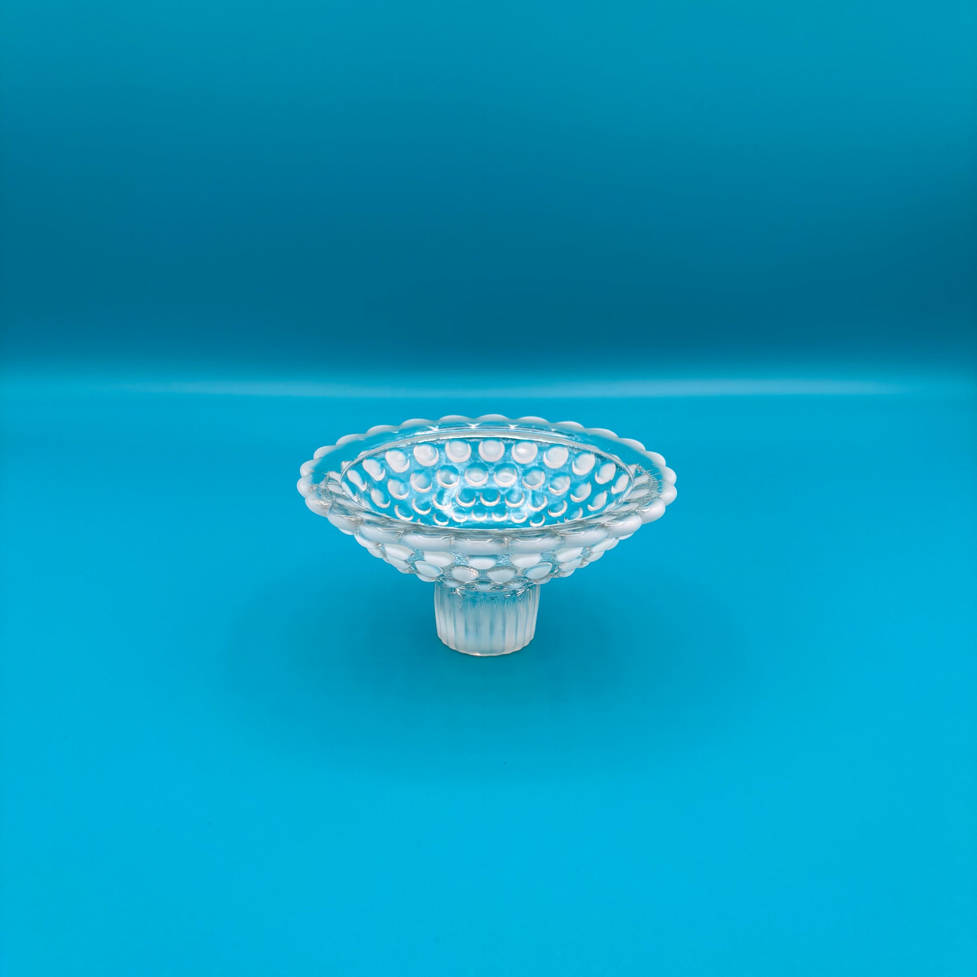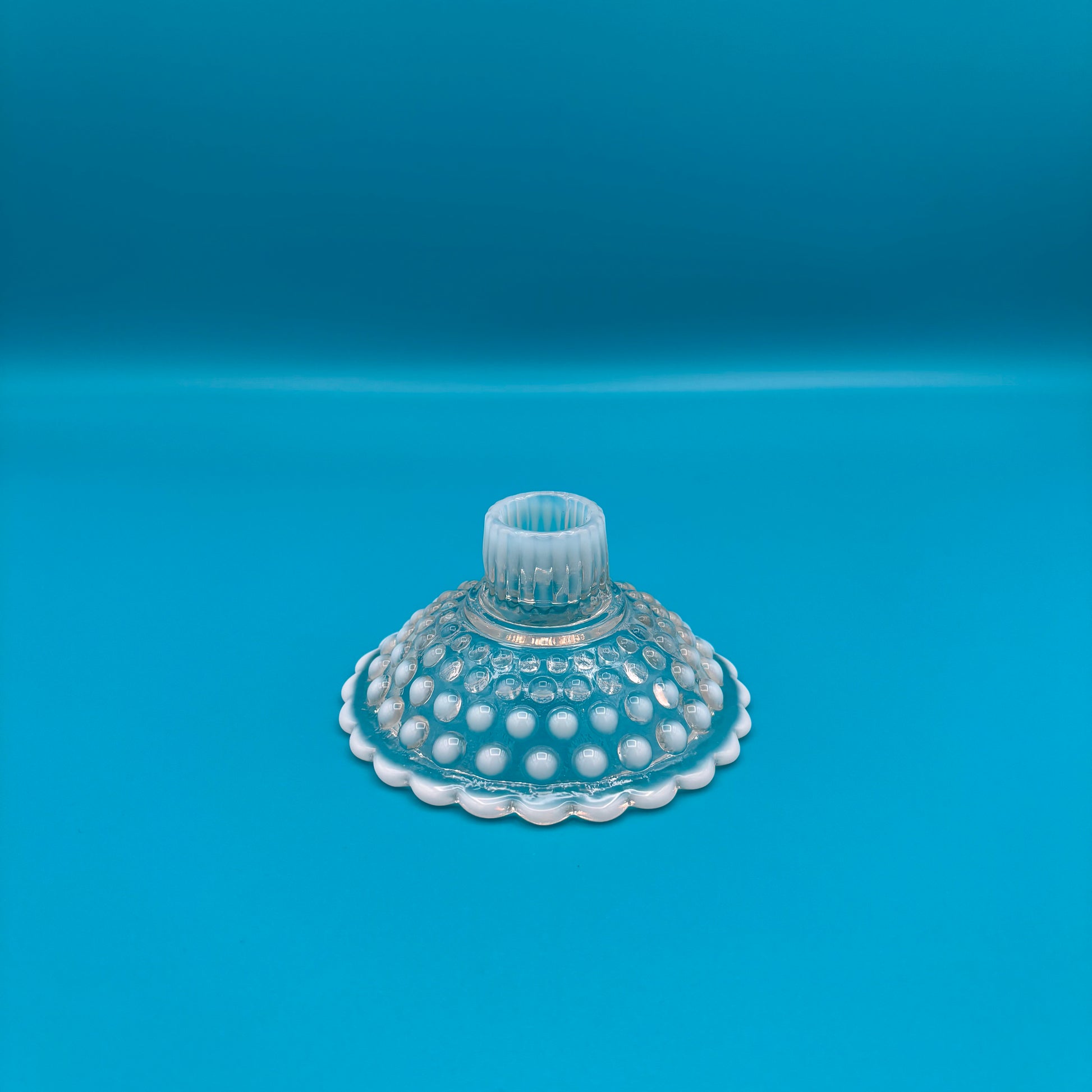Light up a room with this charming candlestick holder from the Fenton Moonstone collection! This vintage beauty from the 1940s features iconic hobnail texture with opalescent glass that fades to a milky tone and a delicate scalloped edge. A timeless piece perfect for creating cozy ambiance, displaying, or gifting to a fellow glass collector.